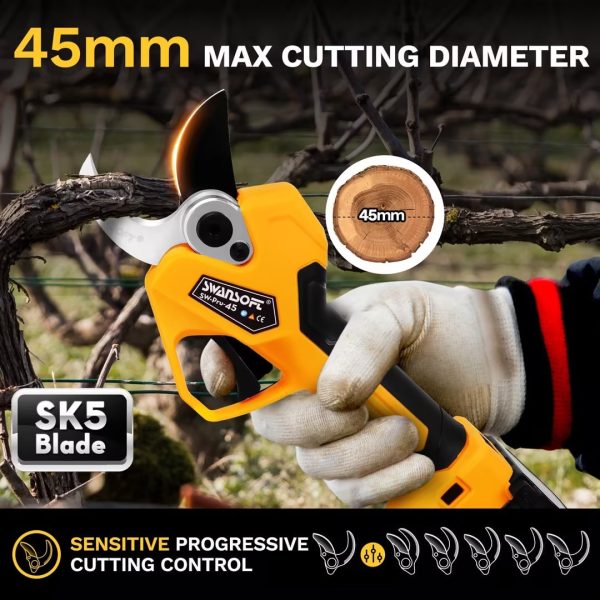 جنس تیغه های قیچی هرس شارژی جدید SWANSOFT سوآن سافت مدل PRU-45 فولاد ضد سایش (SK5) می باشد.