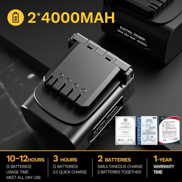 همراه این قیچی دو باتری بزرگ به شما عرضه خواهد شد. ولتاژ این باتری ها ۲۵.۲ ولت و ظرفیت آن ها ۴ آمپر ساعت می باشد.